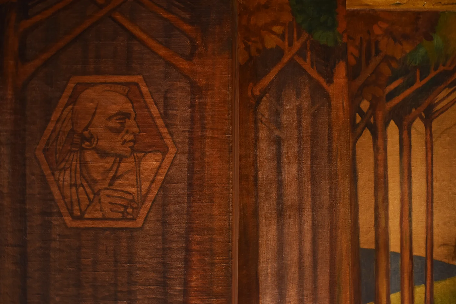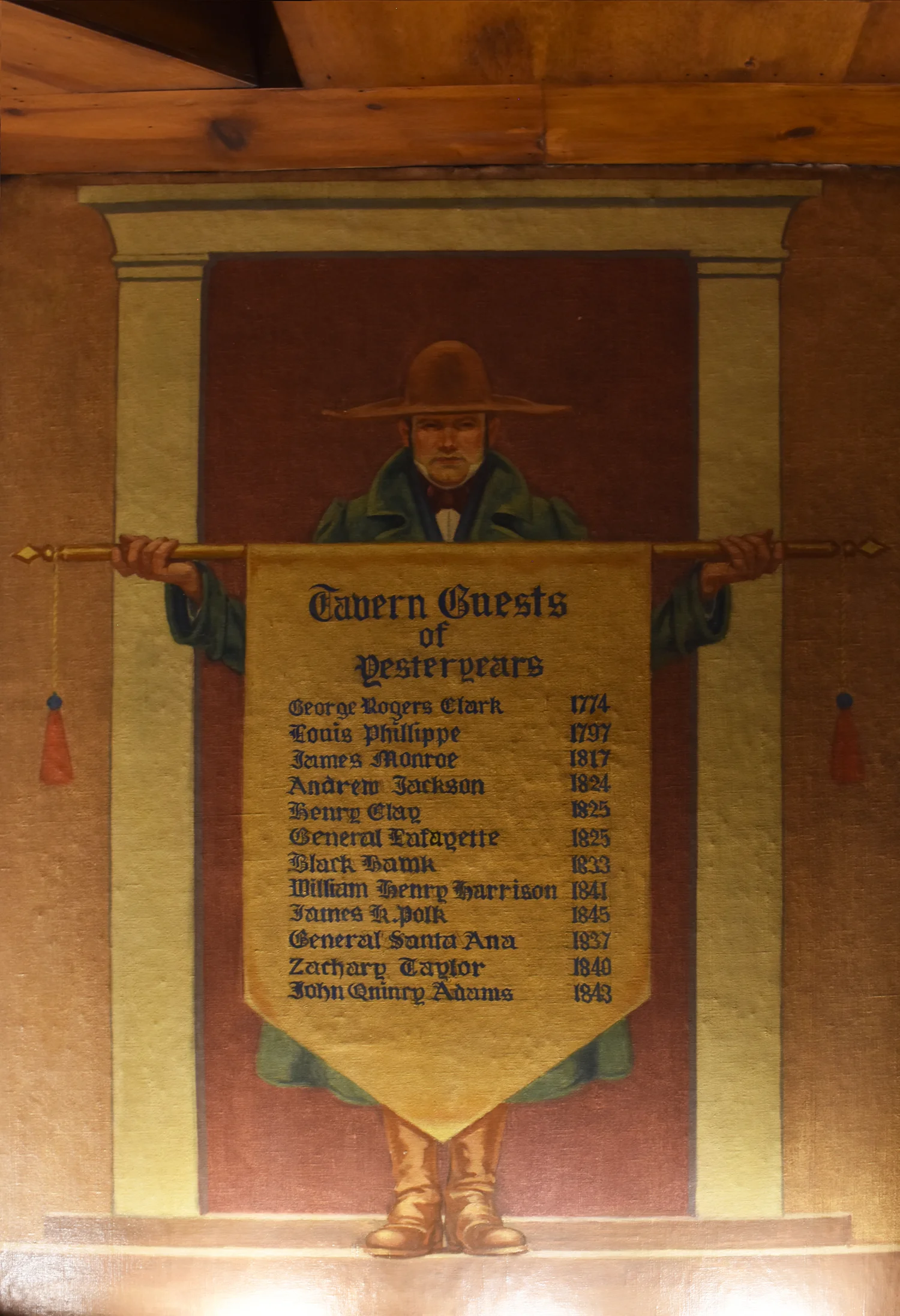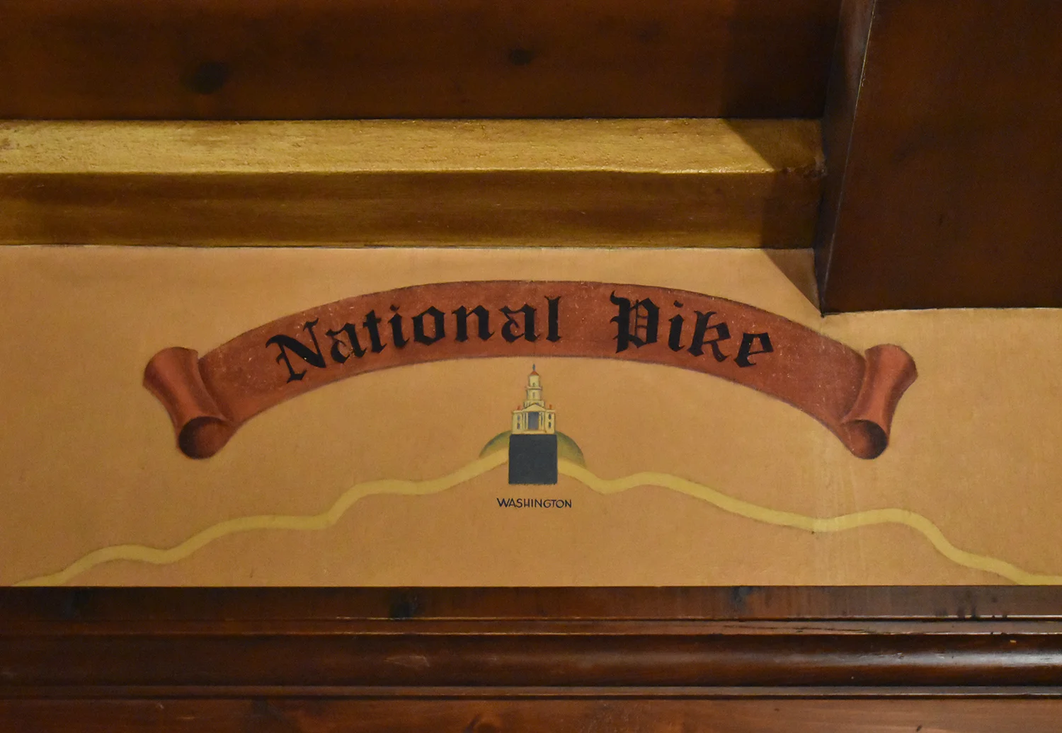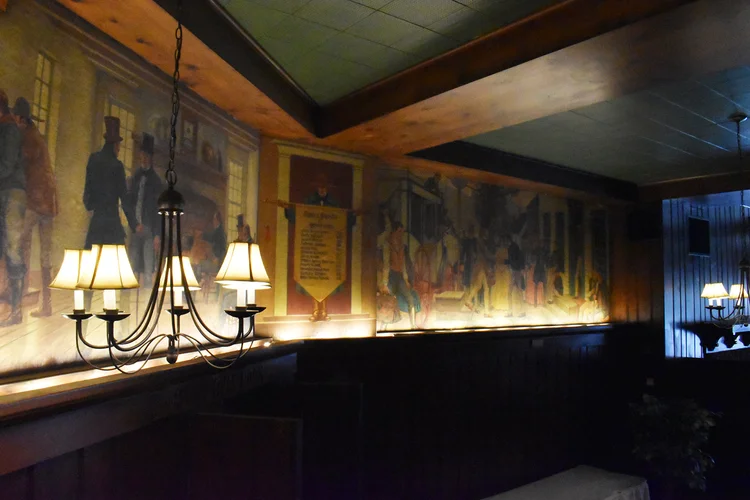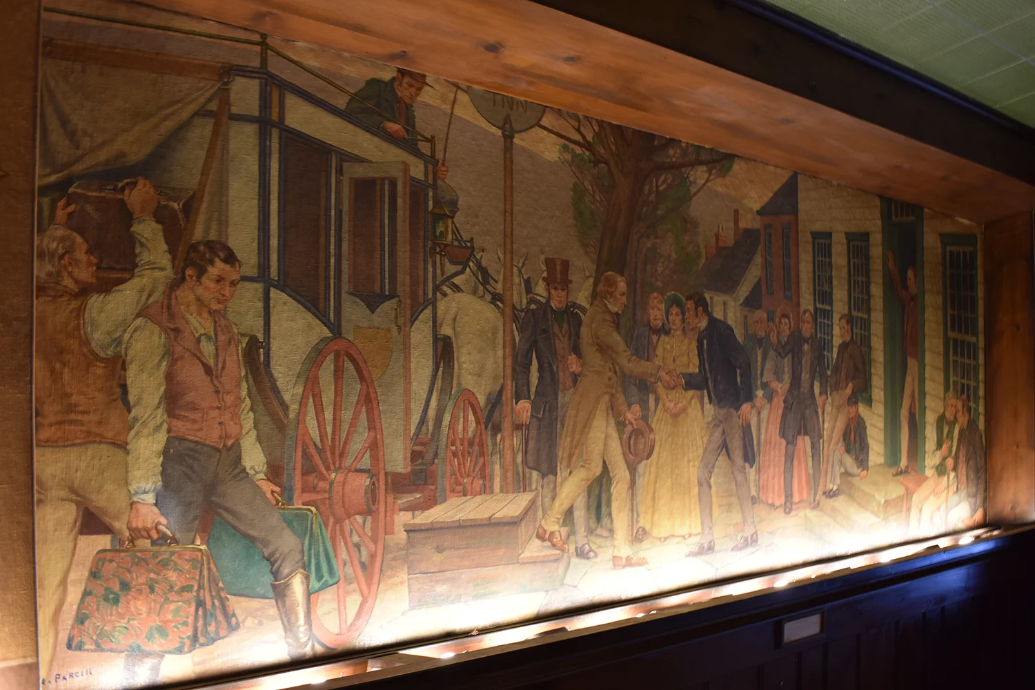 Malcolm Parcell created 6 murals for the Pioneer room. The Conestoga Wagon, Pony Express, Pack Horse, Stage Coach, Lafayette visits Washington, and Bradford’s Escape (not all murals shown on this website). Parcell lived in Washington, PA in a small white house he called Moon Lorn. The name was a reference to trees on the estate that obscured Parcell’s view of the moon. This odd house became part of his artistic legacy too. Parcell designed the place by adding new rooms onto an older structure and fashioning both interior and exterior into a romantic cottage of mainly colonial design.
